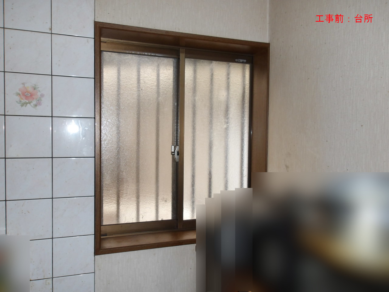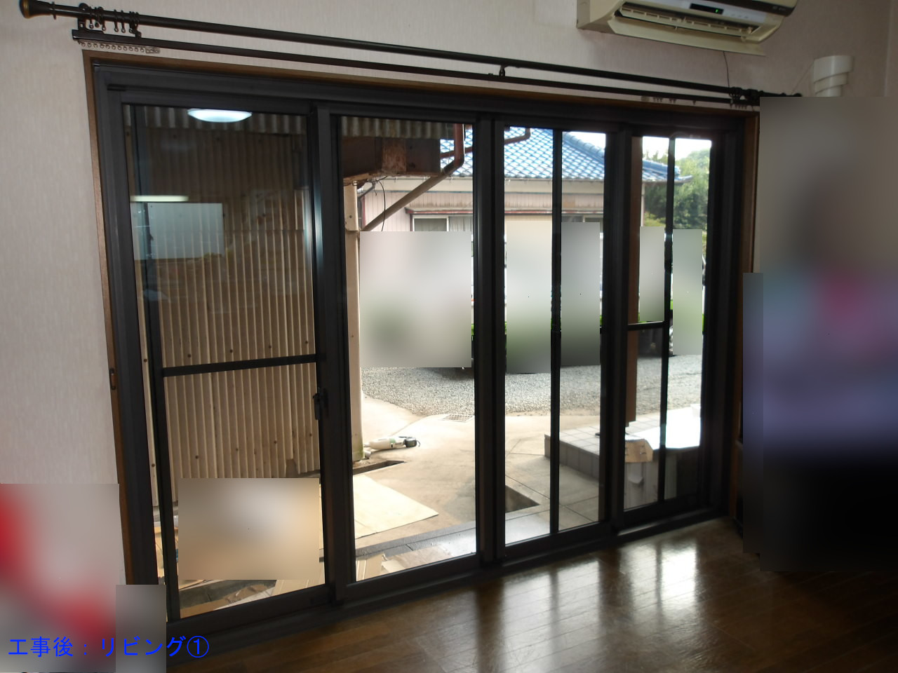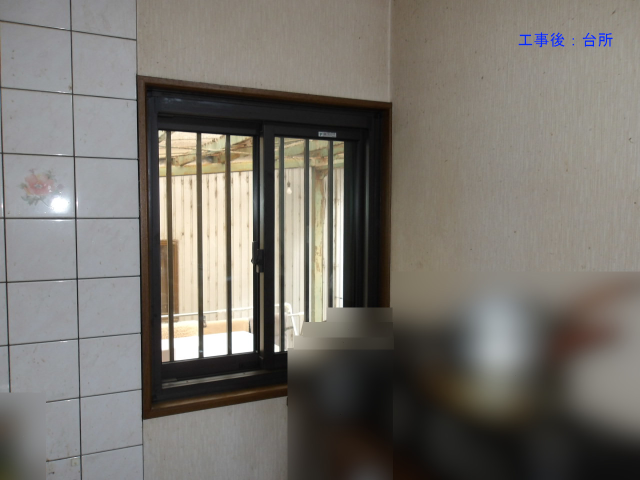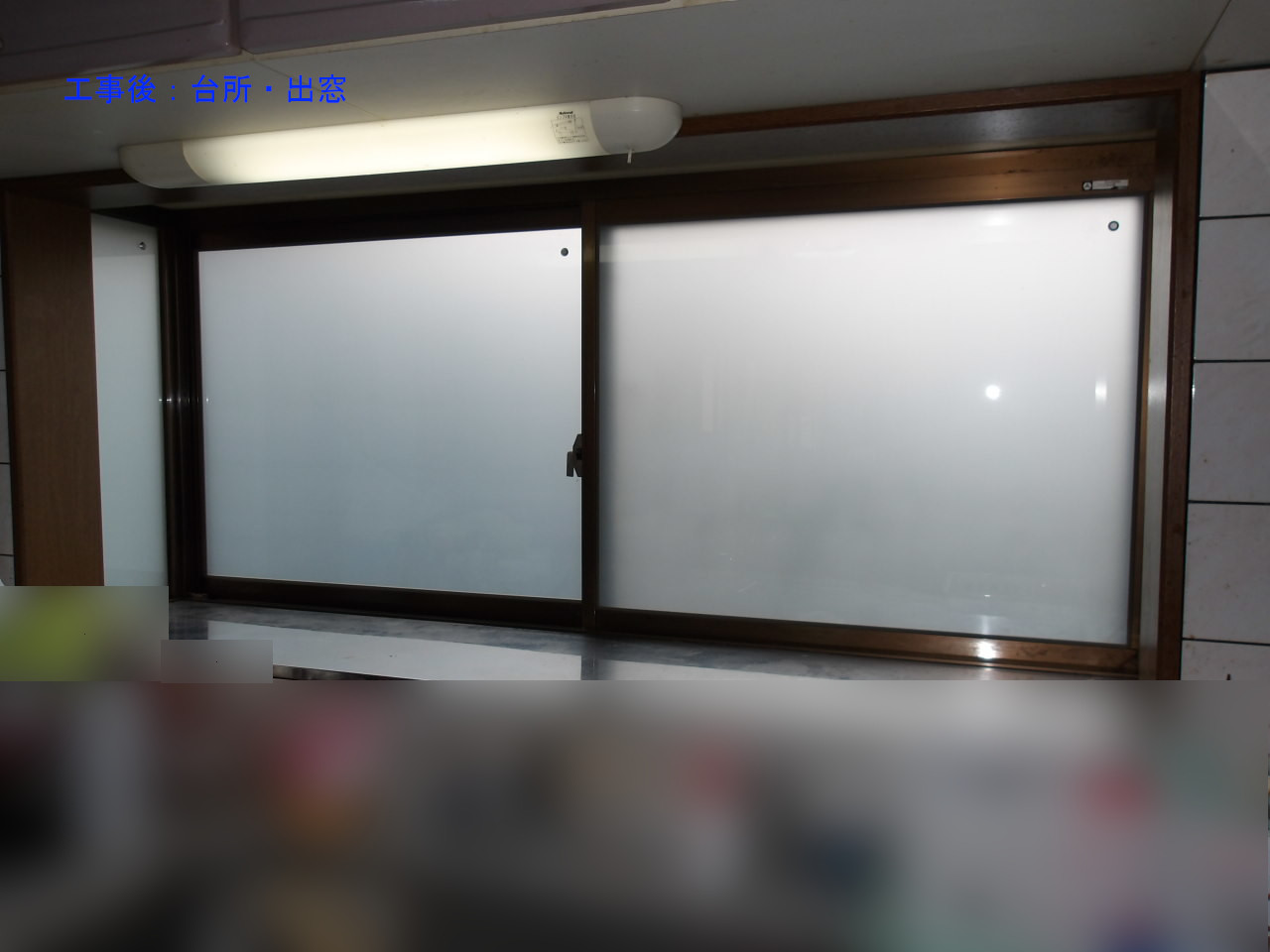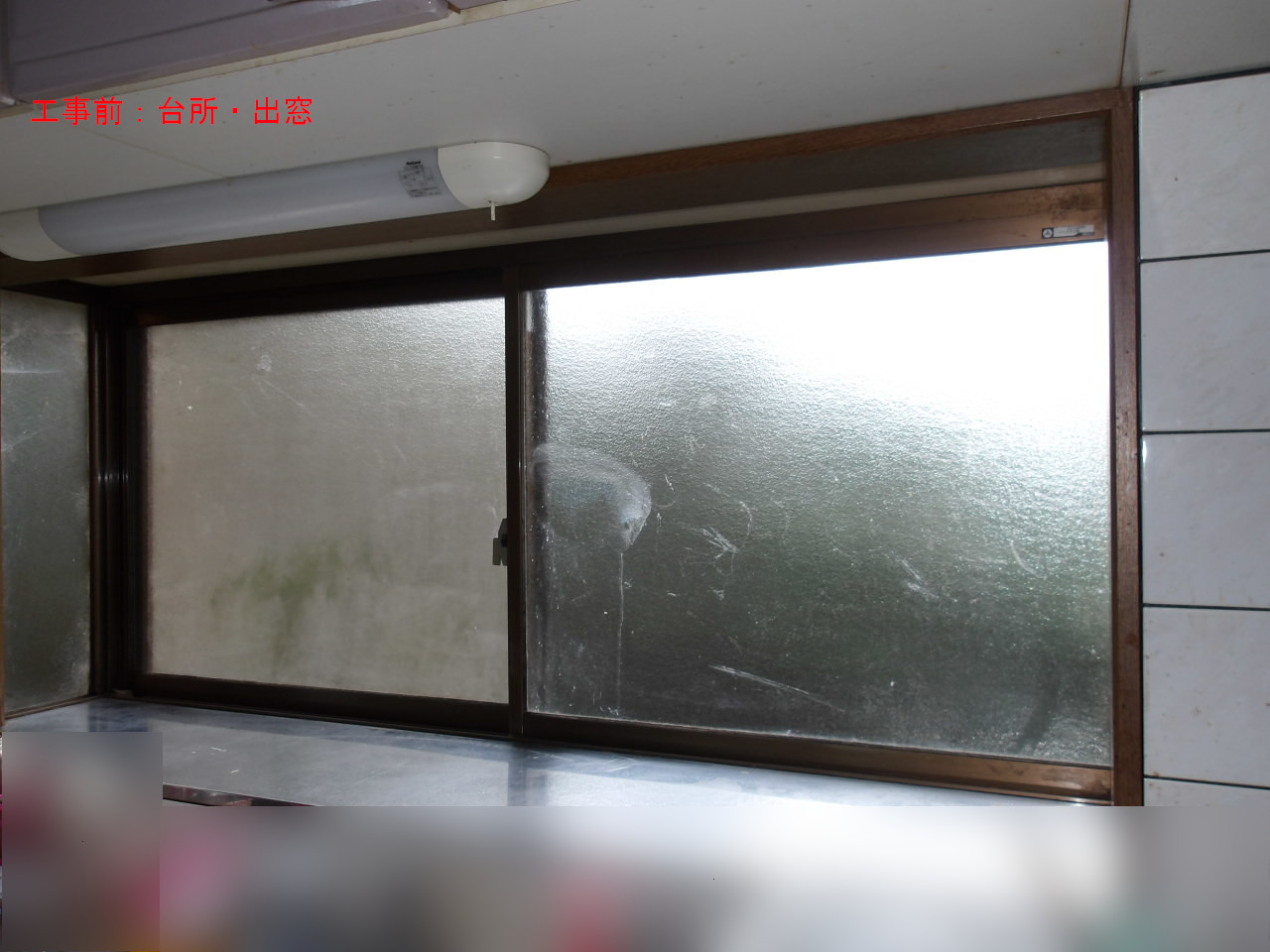 リビング2ヶ所、台所1ヶ所と勝手口ドアの合計4ヶ所をカバー工法で取り替え、台所の出窓はガラス交換を行いました。